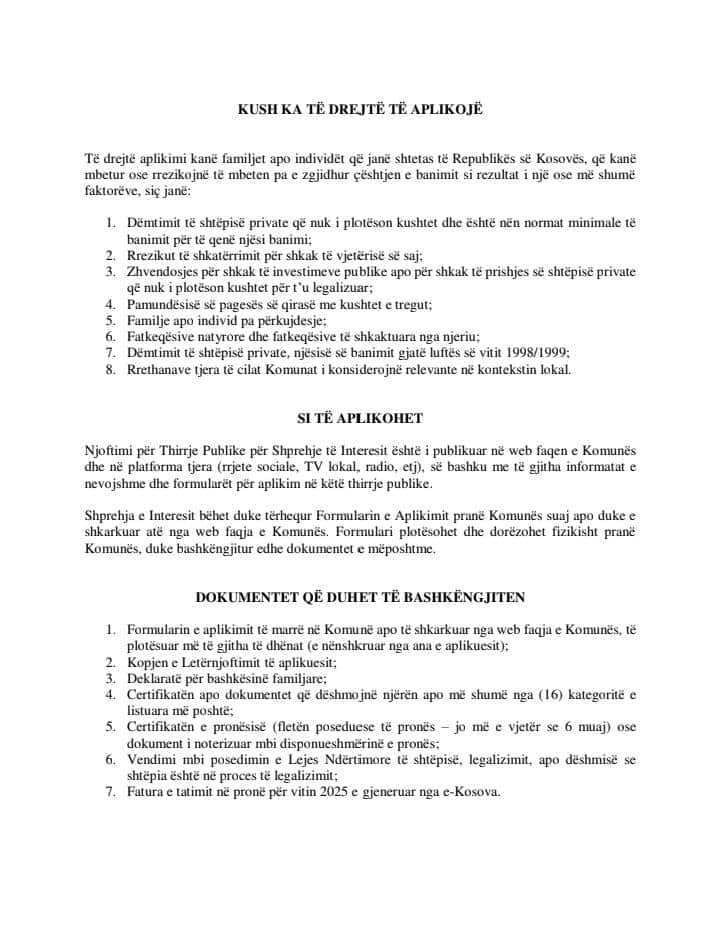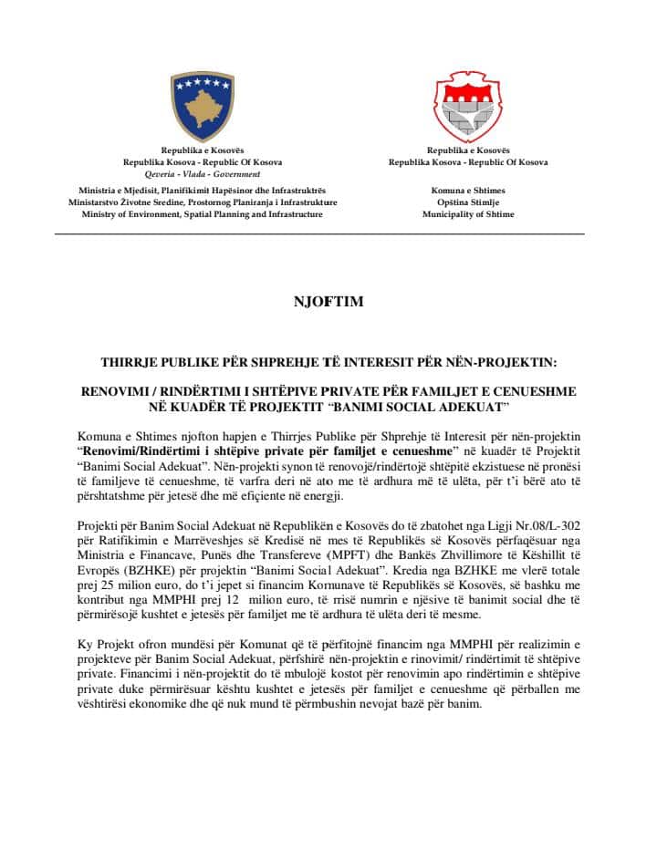 omuna e Shtimes, në bashkëpunim me Ministrinë e Mjedisit, Planifikimit Hapësinor dhe Infrastrukturës (MMPHI), shpall thirrje publike për aplikim në kuadër të projektit “Banimi Social Adekuat”.